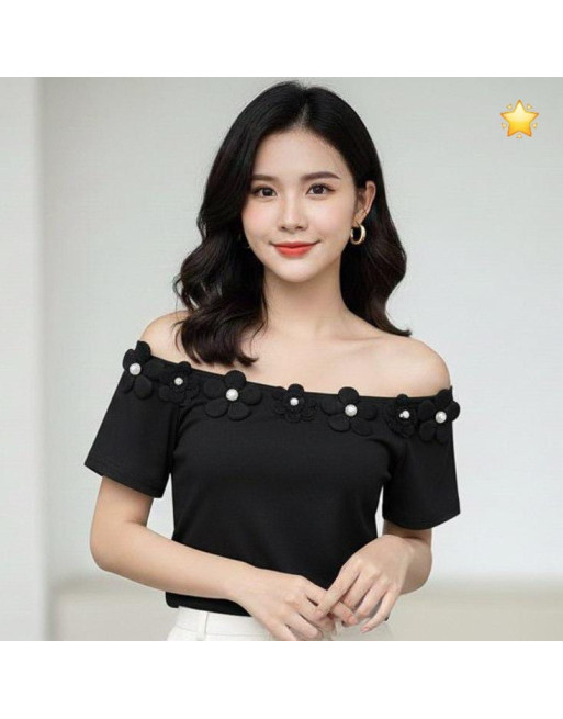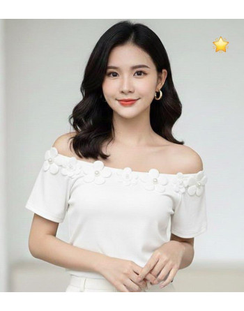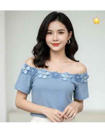 Blusa en mangas cortas cuello bandeja y detalles de flores