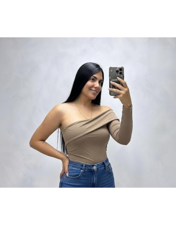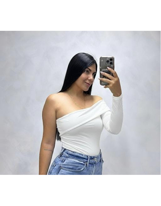 Eleva tu look diario con este body asimétrico, una pieza clave que combina elegancia y un toque audaz. Su diseño de un solo hombro con detalle de drapeado cruzado en el pecho crea una silueta sofisticada y ultra femenina, ideal tanto para una salida casual como para un evento de noche.